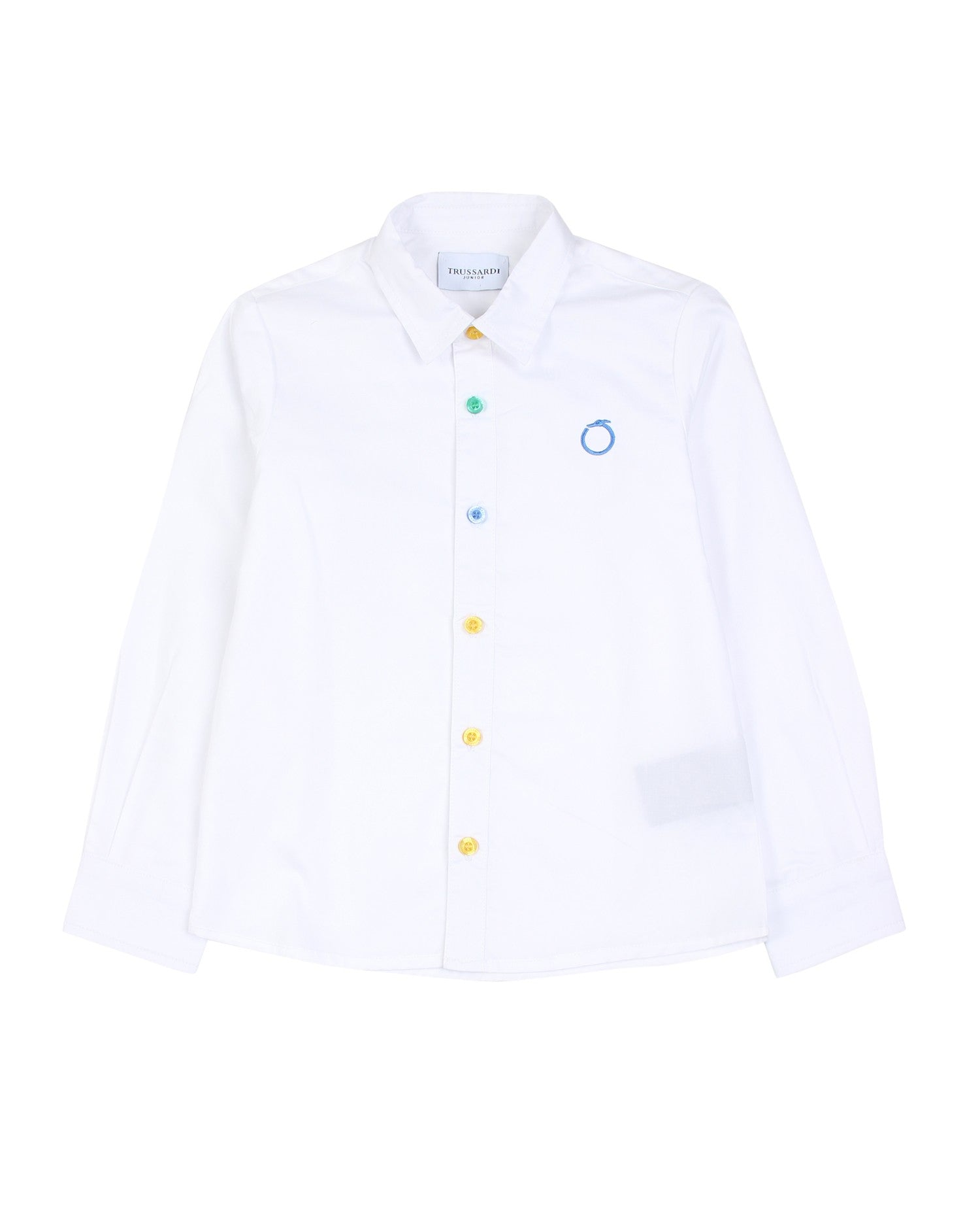 Camicia Trussardi di colore bianco con bottoncini colorati sul davanti e scritta ricamata sulle spalle
