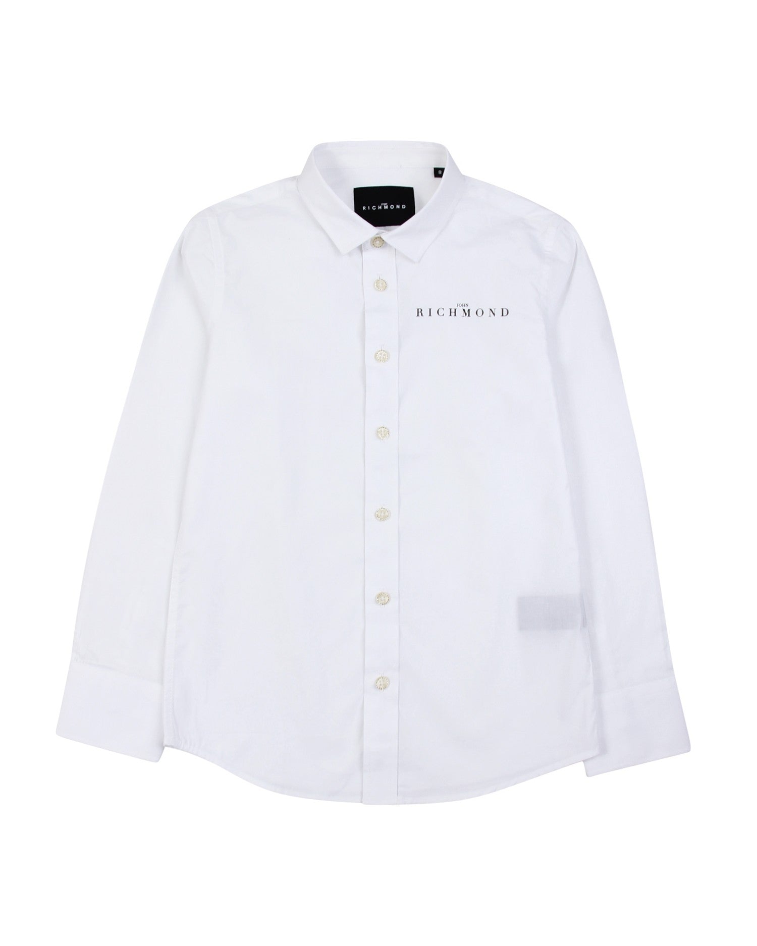 Camicia Richmond bianca con piccola scritta nera sul davanti lato sinistro e scritta sui bottoni