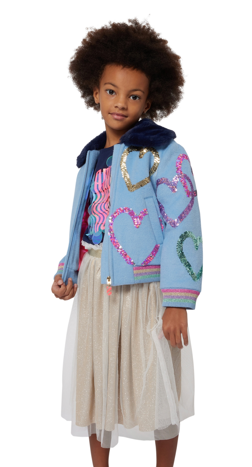 Giacca celeste Billieblush felpata con pelliccia al collo blu , stampe cuori paillette oro e rosa.