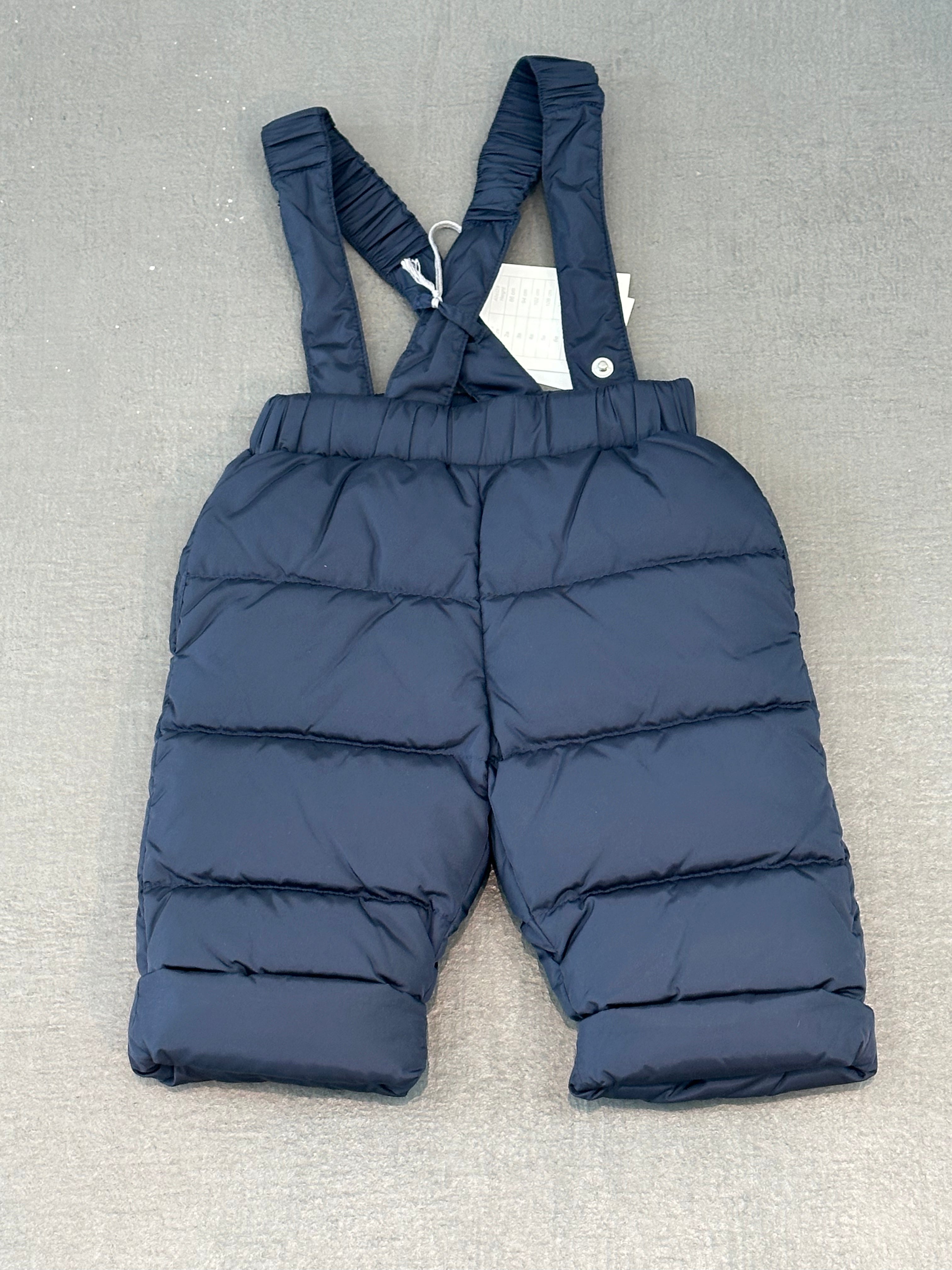 Pantalone sci blu con bretelle regolabili con bottoni. Composizione 90%piumino e 10% piumette