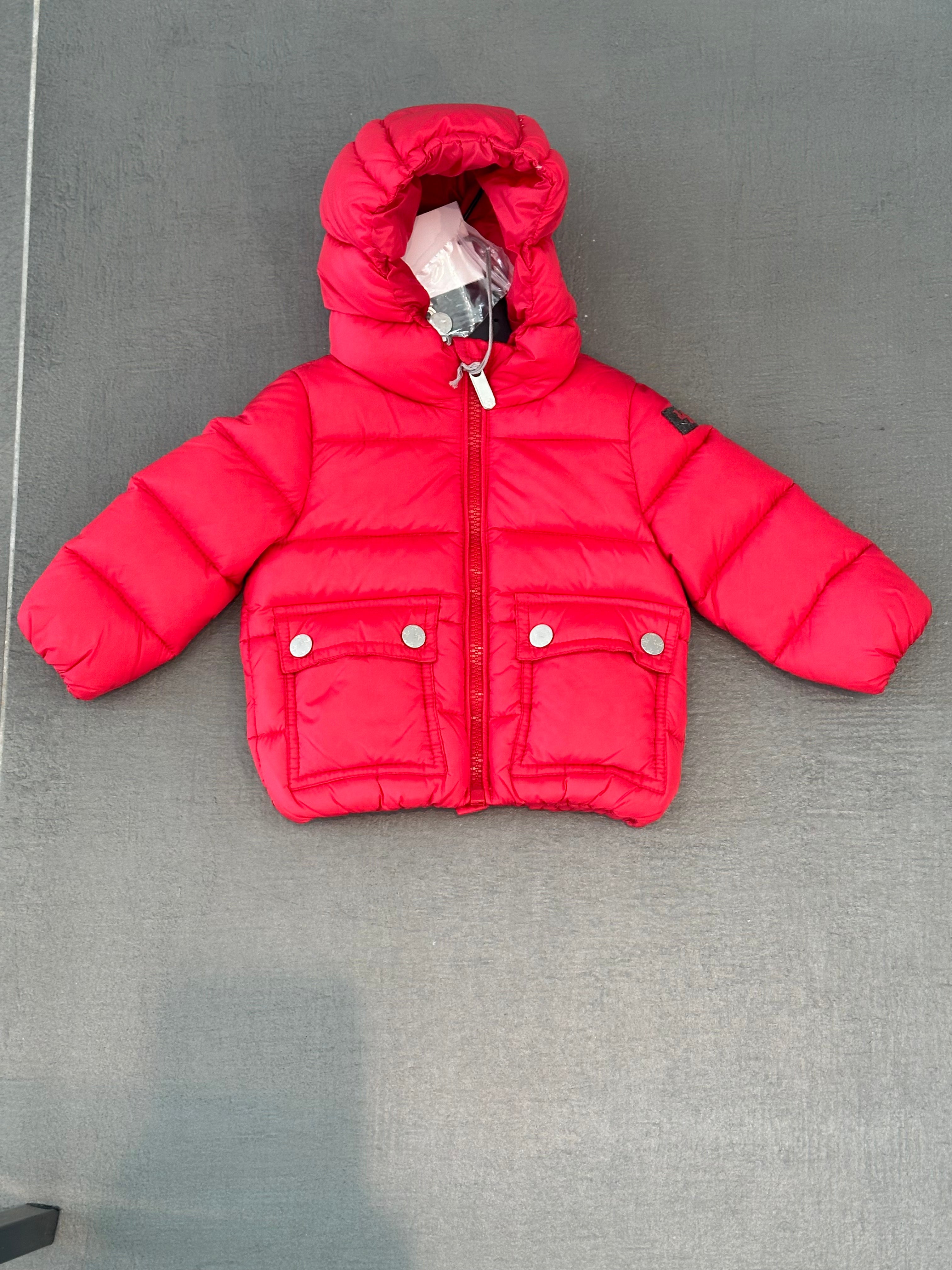Piumino rosso con cappuccio , chiusura zip e due tasche sul davanti. Composizione 90% piumino e 10% piumette