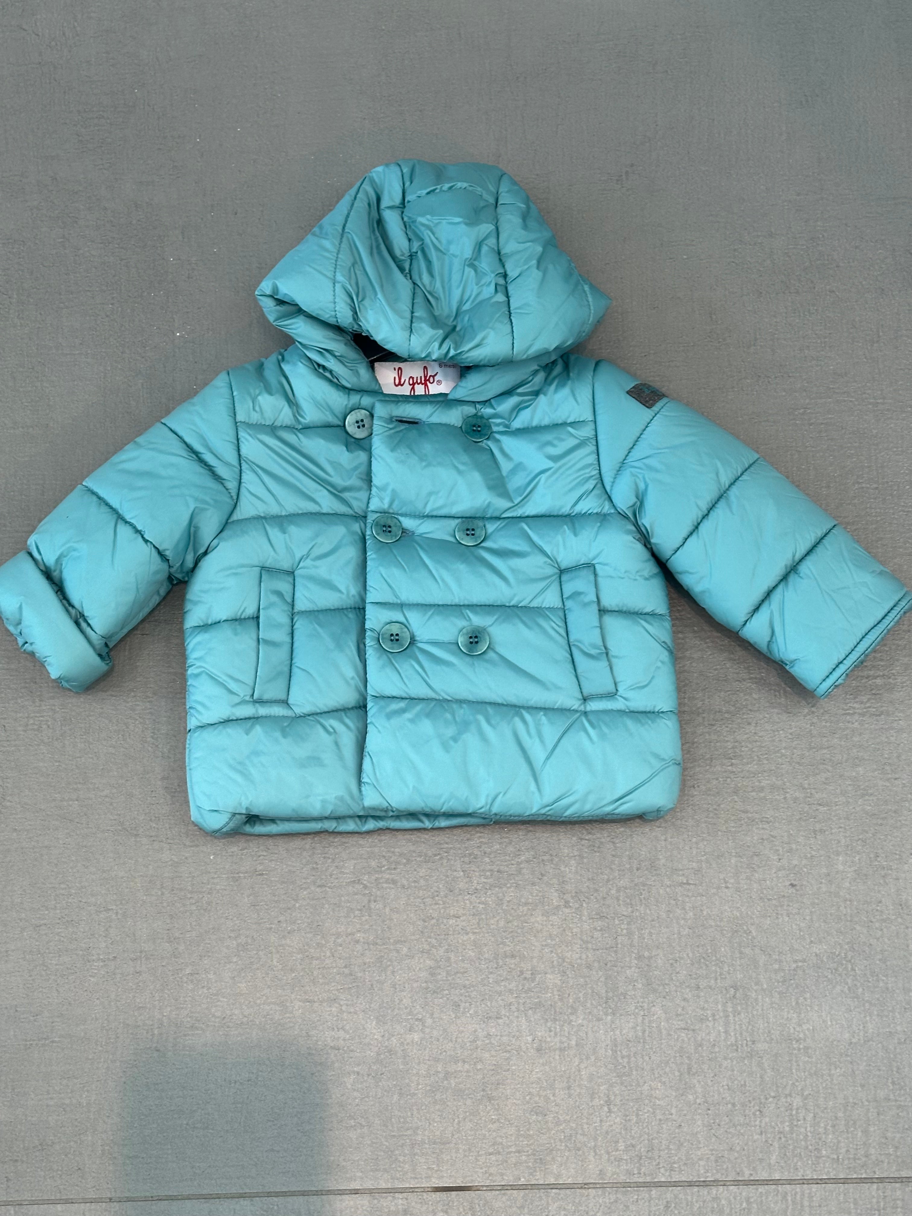 IlGufo piumino celeste con tasche sul davanti e cappuccio