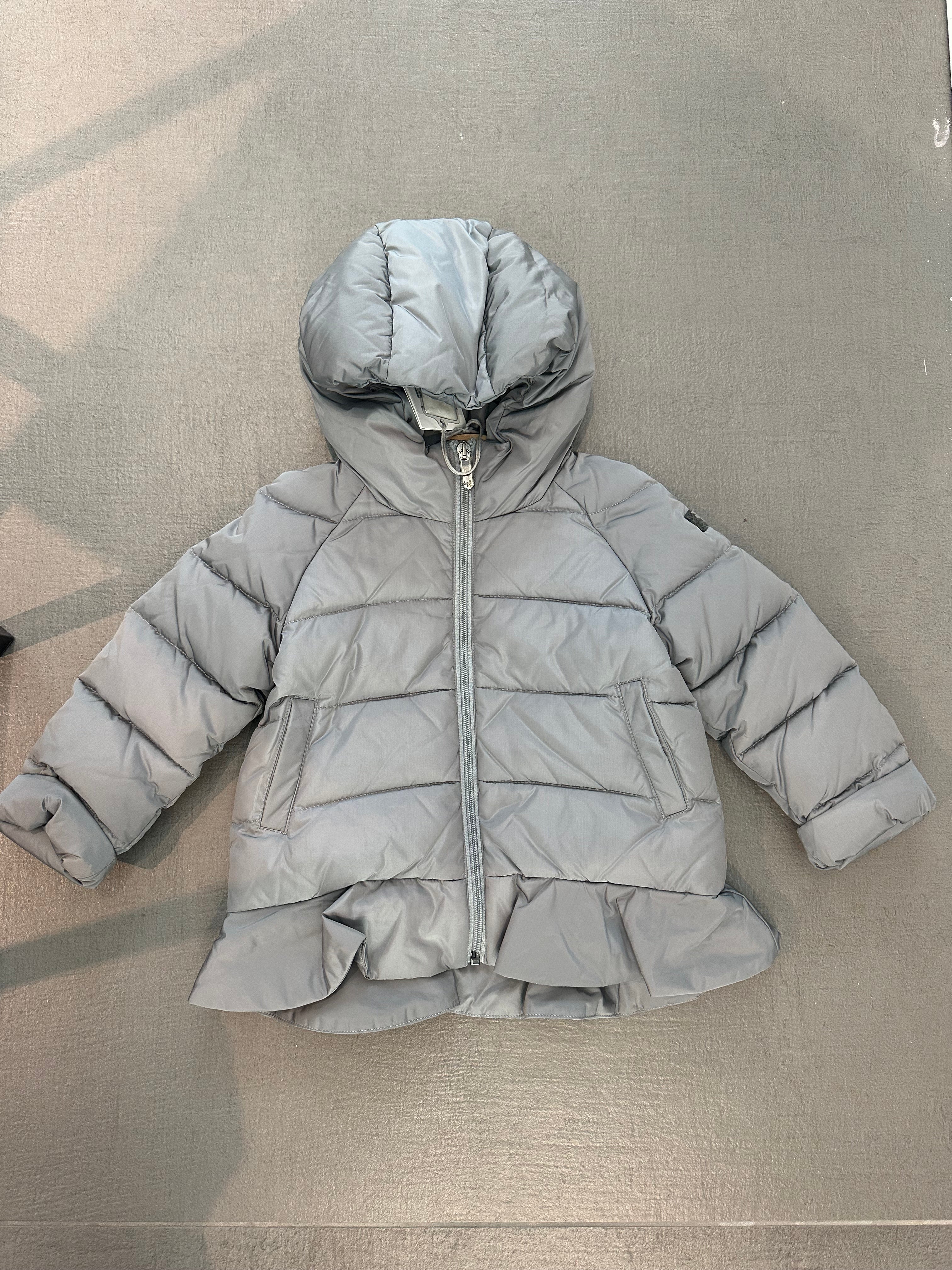 IlGufo piumino grigio con cappuccio e balze sul fondo