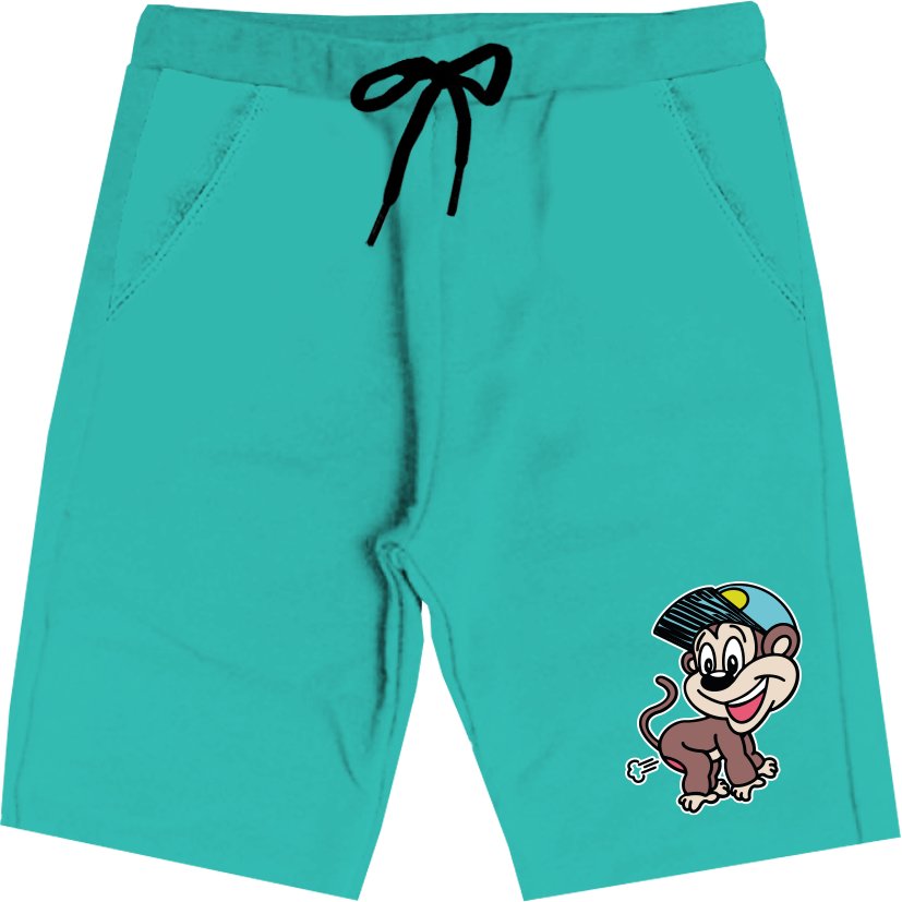 Bermuda Mousse in felpa con elastico e coulisse in vita di color smeraldo con stampa scimmia sulla gamba sinistra