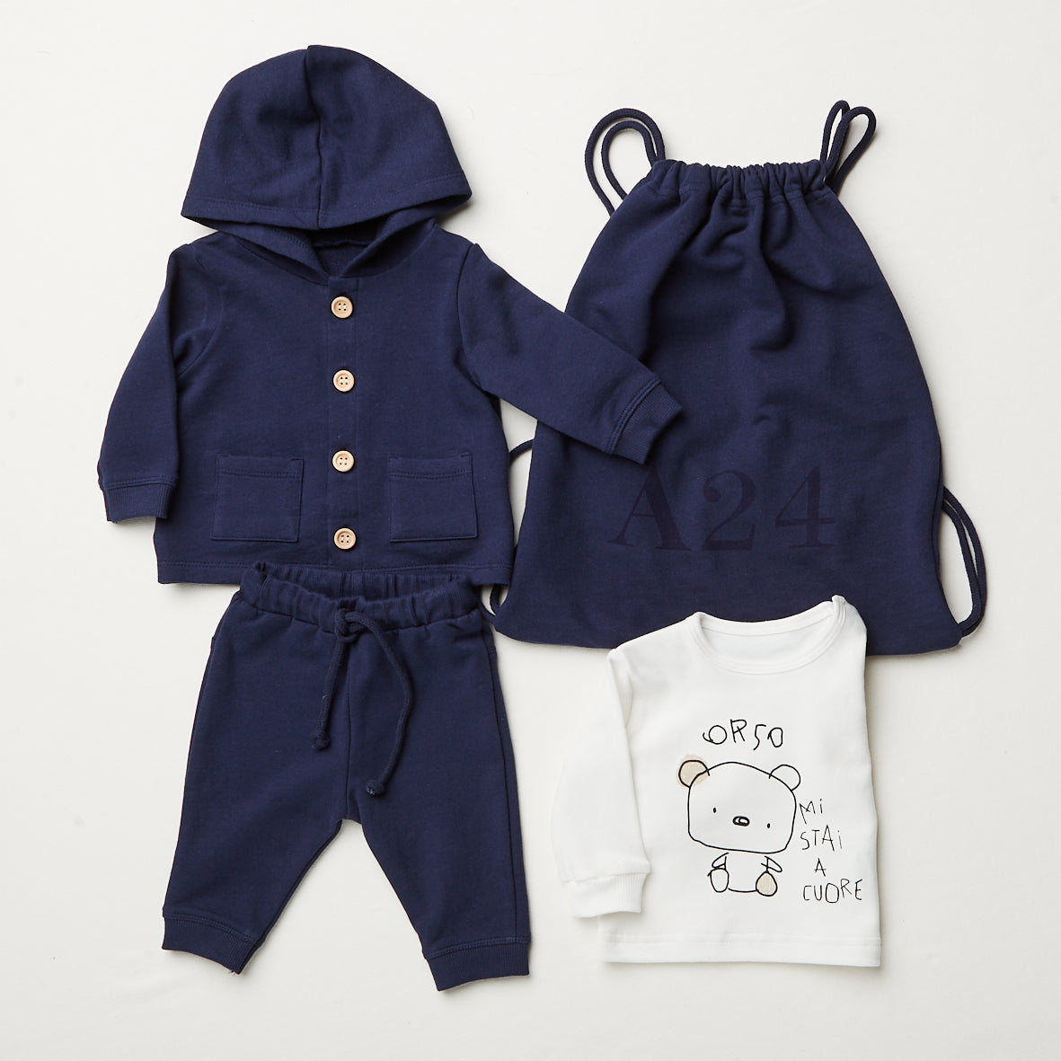Tuta in felpa tre pezzi pantalone con laccio regolabile t shirt felpa con bottoni sul davanti marroni e sacca