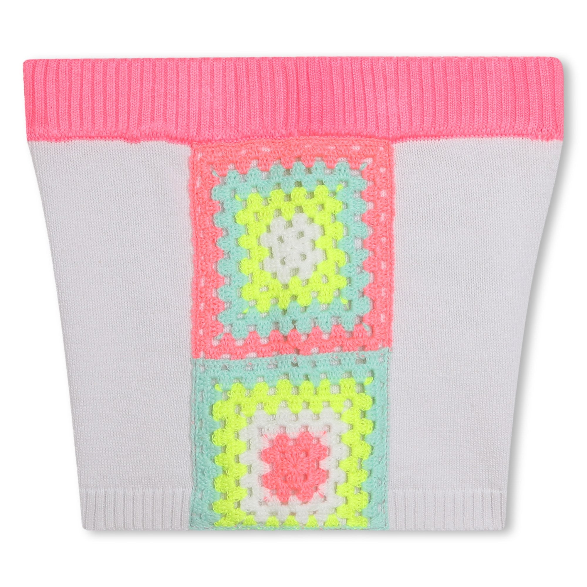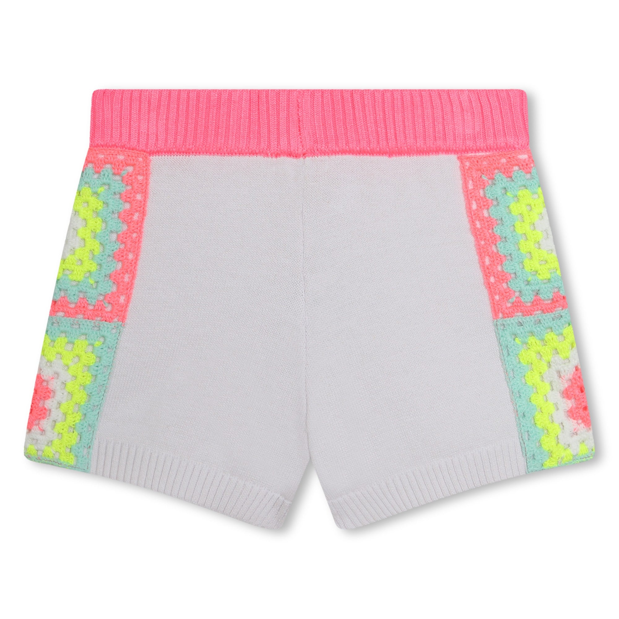 Pantaloncino Billieblush bianco in maglia con elastico in vita di color fucsia e fantasia ricamata multicolor laterale