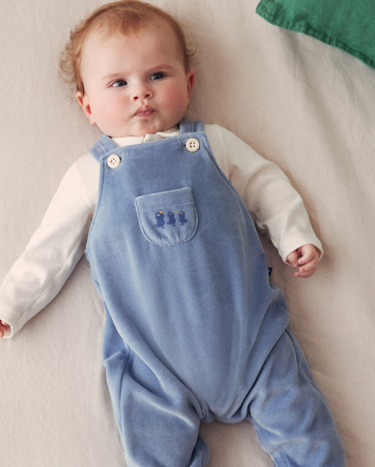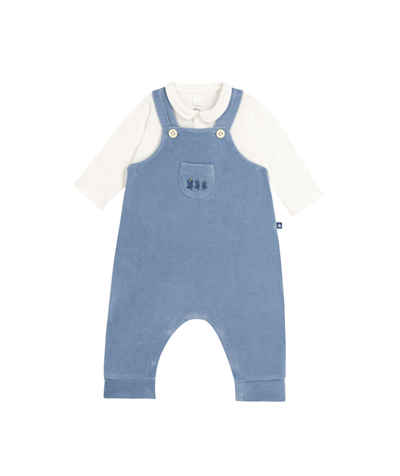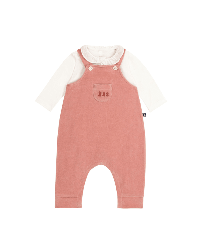 Salopette Petit Bateau in velluto con pulcini e body bianco con collo rifinito
