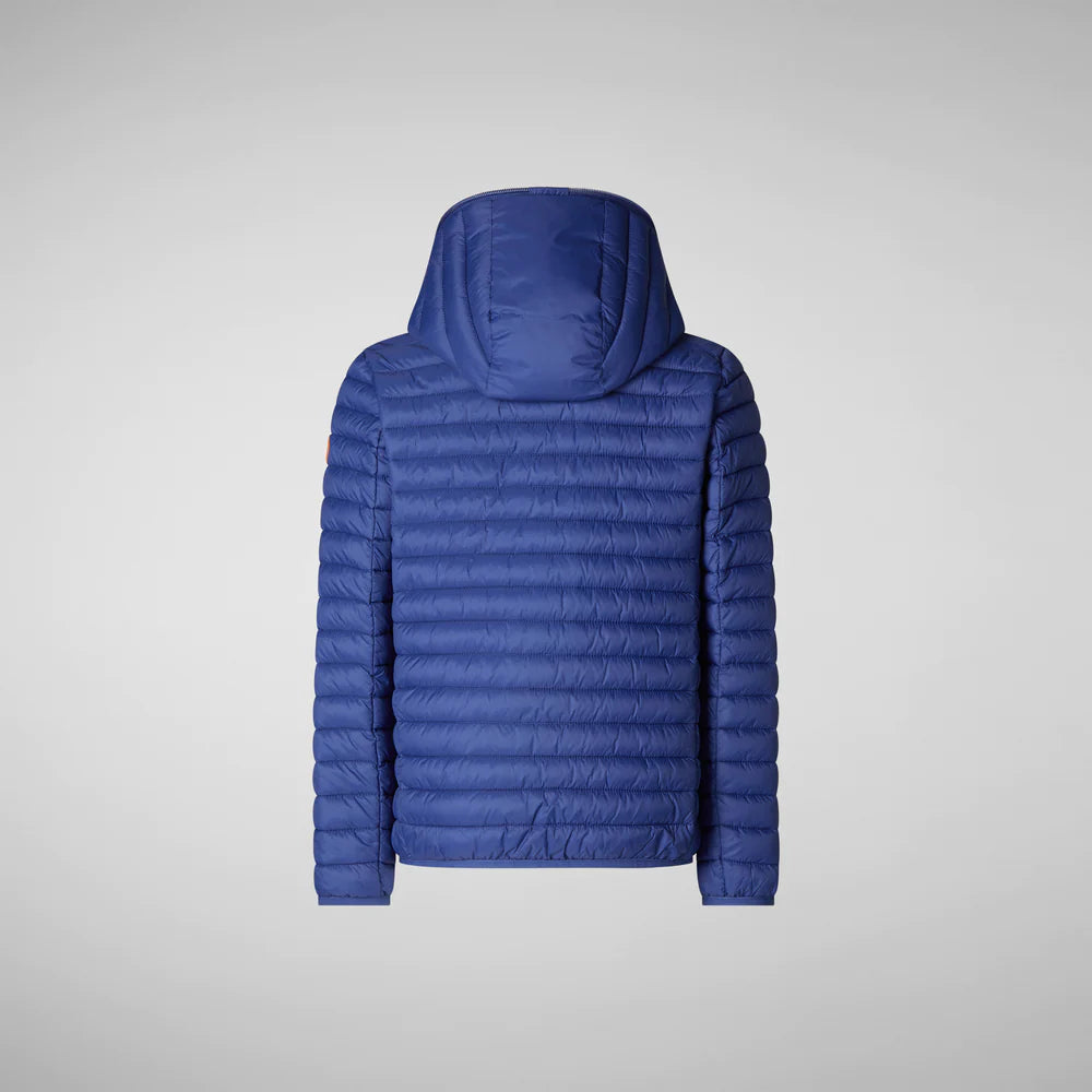 Giacca 100 grammi Save The Duck con zip centrale e cappuccio di colore blu elettrico adatto per le mezze stagioni