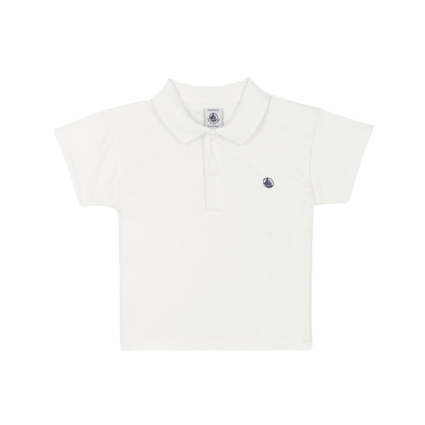 Polo Petit Bateau di colore bianco con colletto e 3 bottoncini sul davanti