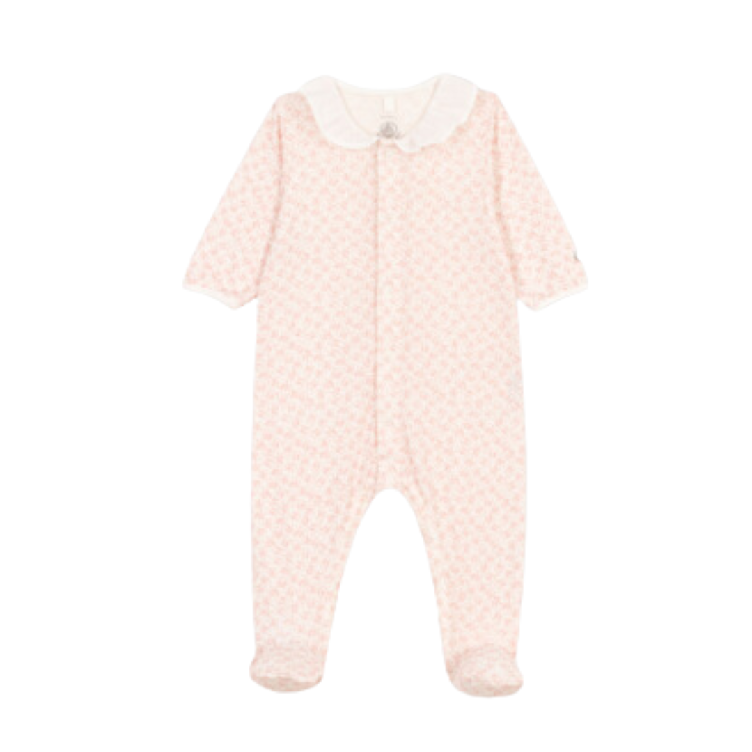 Tutina Petit Bateau con fantasia fiori di color rosa pallido e colletto bianco con apertura sul davanti