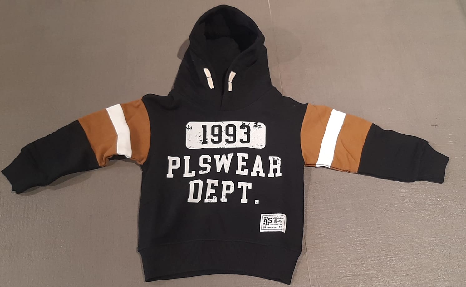 Felpa Please nera con cappuccio stampe sul davanti e manica a righe nera marrone e bianca