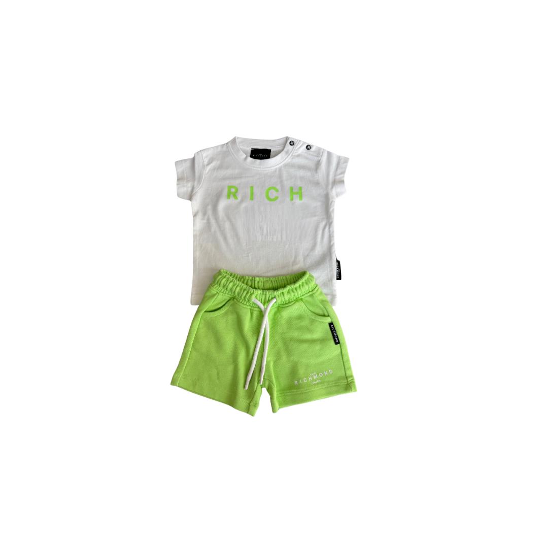Completo Richmond tshirt girocollo mezza manica con scritta "Rich" sul davanti in verde lime e bermuda verde lime con elastico e coulisse con tasche