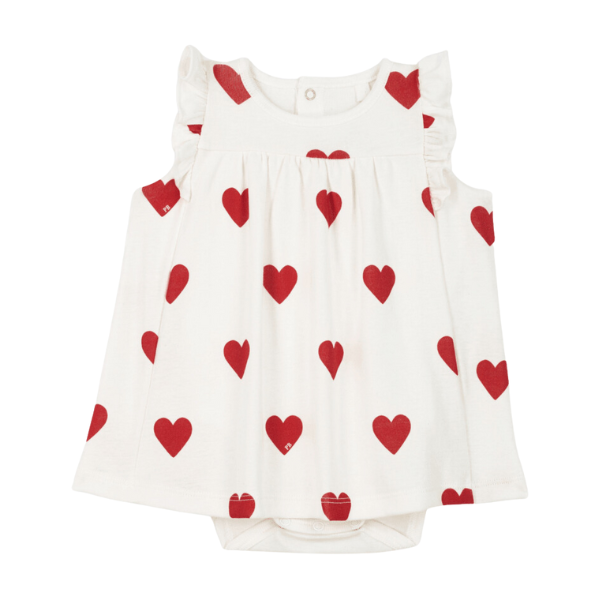 Abito Petit Bateau smanicato con piccolo dettaglio di volant sulle spalle con body incorporato con fantasia cuori rossi