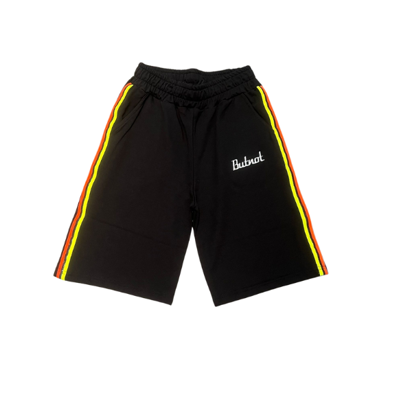 Bermuda ButNot di colore nero con piccola scritta sul lato sinistro e banda giallo e arancio fluo sui laterali