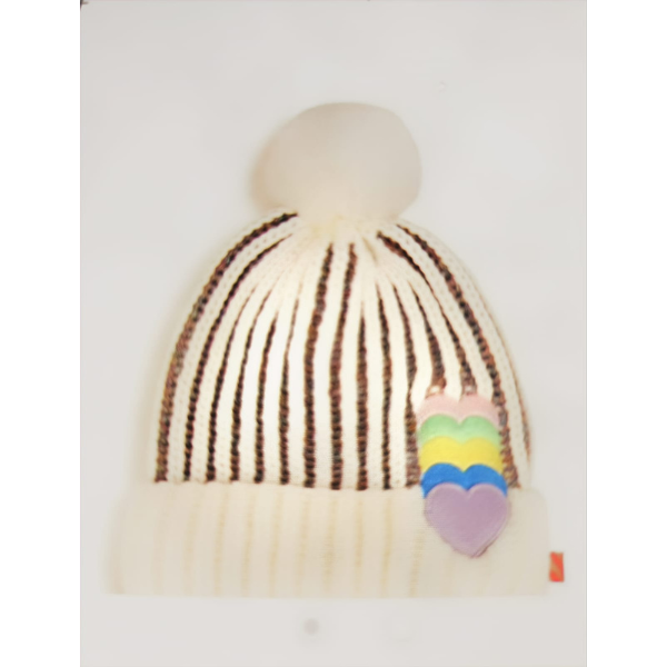 Berretto Billieblush color avorio con finitura a costine con pompon e ricamo di cuori