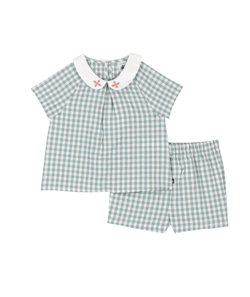 Completo Petit Bateau pantaloncino con elastico in vita e camicia mezza manica con colletto con ricamo fiore con fantasia quadretti color salvia e bianco
