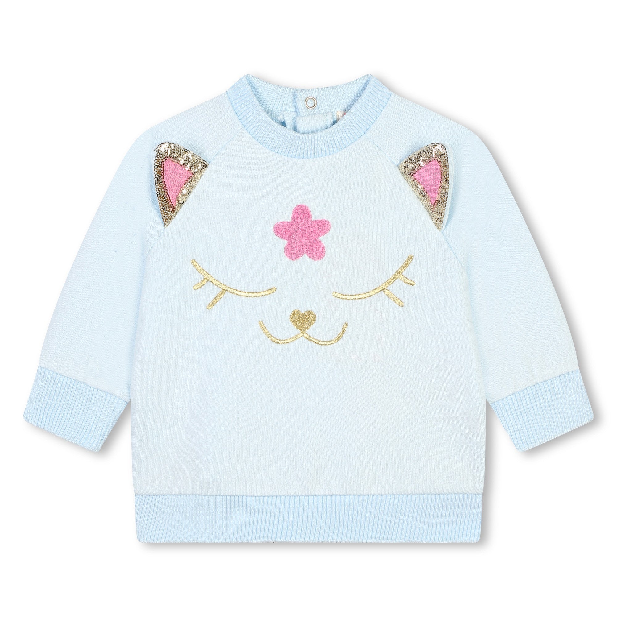 Completo Billieblush celeste , felpa girocollo con gatto sul davanti e fiore rosa e glitter oro.