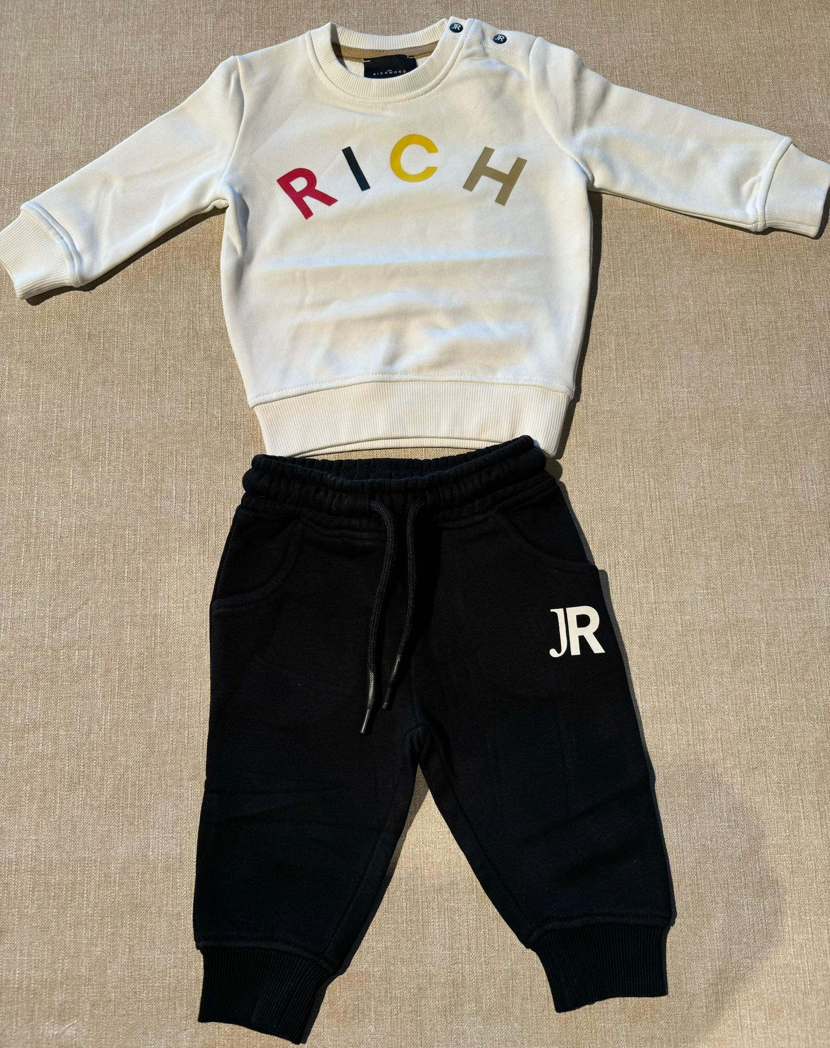 Completo Richmond felpa girocollo bianca con scritta multicolor "Rich" sul davanti e pantalone in felpa nero con coulisse, elastico in vita e tasche