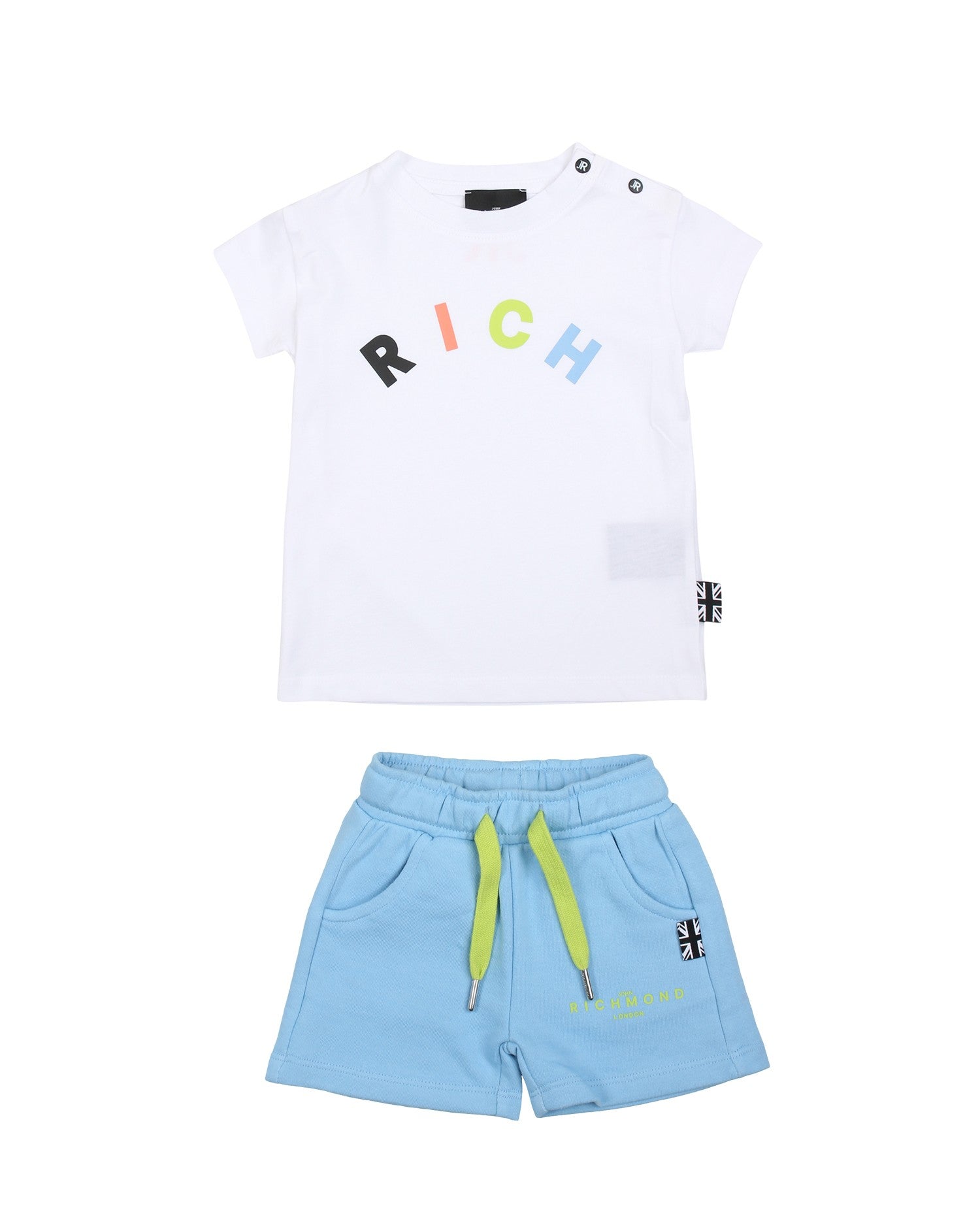 Completo Richmond con tshirt a mezza manica bianca con scritta "Rich" colorata sul davanti e bermuda di color azzurro con elastico e coulisse in vita con tasche e scritta verde lime sulla gamba sinistra
