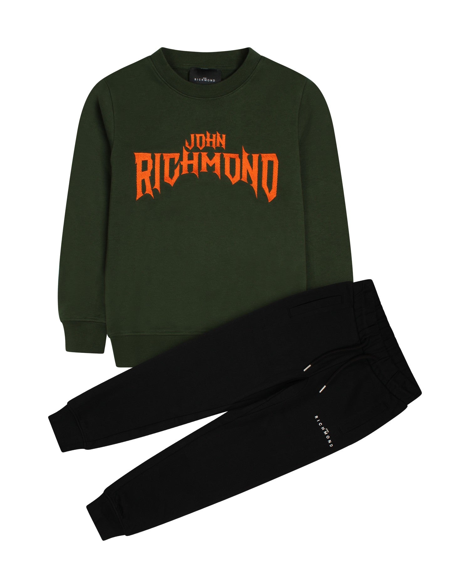 Completo Richmond tuta con felpa verde girocollo con scritta arancio e pantalone nero con coulisse ed elastico in vita ed elastico sul fondo