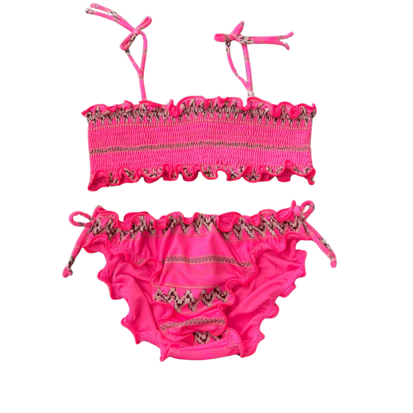 Costume 2 pezzi F**k di colore fucsia con disegni beige e neri con parte sopra a fascia con lacci sulle spalle e arricciatura e parte sotto con rouches e fiocchetti laterali