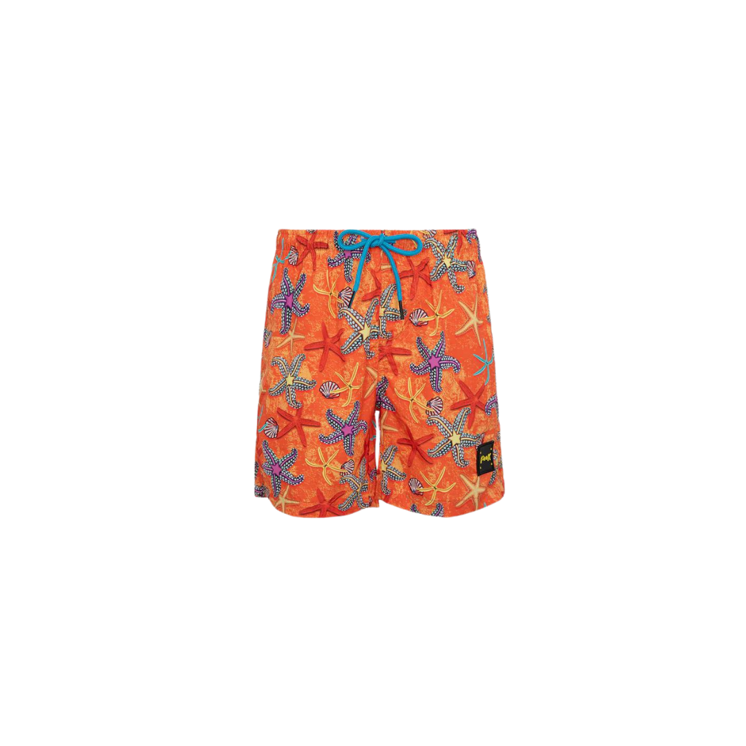 Costume F**k a pantaloncino di color arancio con fantasia stelle marine con tasche coulisse ed elastico in vita con piccola targhetta con logo sul davanti