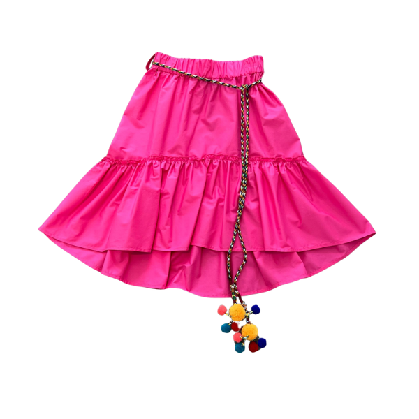 Gonna Dixie lunga di color fucsia con balza sul fondo e coulisse colorata con pom pom in vita