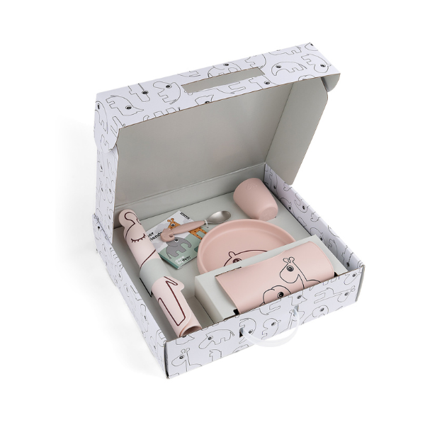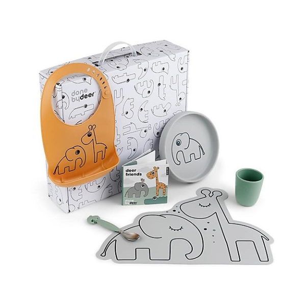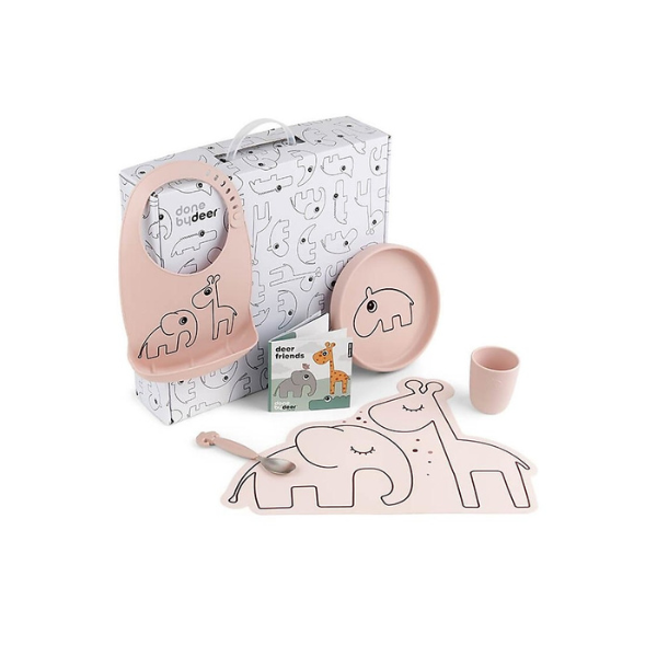 Set prima pappa con bavaglino, tovaglietta, piatto, cucchiaio e mini Tazza