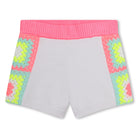 Pantaloncino Billieblush bianco in maglia con elastico in vita di color fucsia e fantasia ricamata multicolor laterale