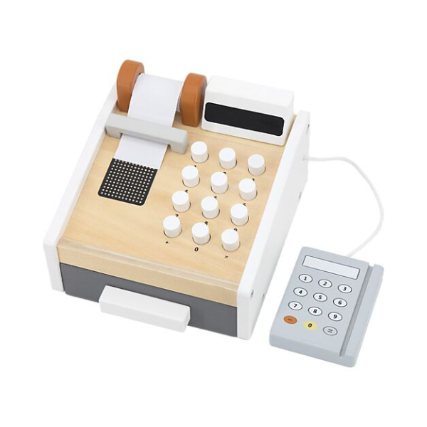 Registratore di cassa in legno Tryco che include tanti elementi interattivi che stimolano ll gioco imitativo nei bambini