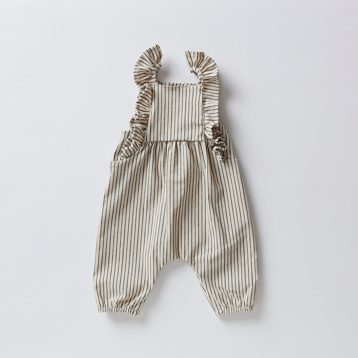 Salopette Aventiquattrore in tela con piccole righe blu e rouches sul giro manica e bottoncini sul retro