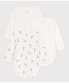 Set 3 body Petit Bateau manica lunga antipanico : uno bianco uno fantasia conigli grigi e uno con piccoli pois grigi