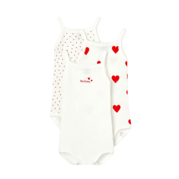 Set 3 pezzi di body Petit Bateau smanicati con bretella sottile uno bianco con piccola scritta rossa uno con cuori grandi rossi uno con cuori piccoli rossi