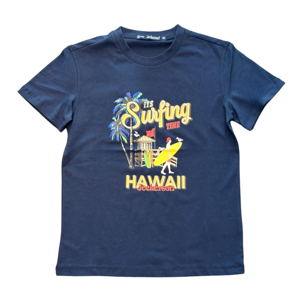 Tshirt di colore blu a mezza manica con stampa "Surfing Hawaii"